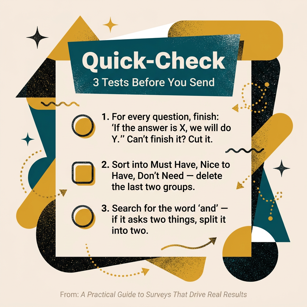 For every question you are considering, try this simple test: "If the answer is X, we will do Y. If the answer is Z, we will do W." If you cannot finish that sentence, the question probably does not belong in your survey. This practice alone — called backward design — will cut your survey length in half and double its usefulness.