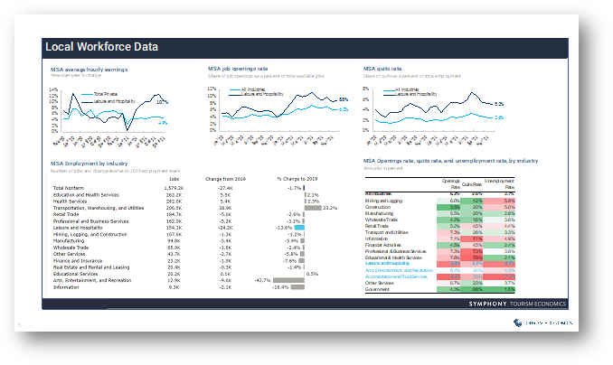 As with every Symphony client, you obtain proprietary destination-specific data and analysis by Tourism Economics with monthly updates covering industry performance, economic trends, visitor intelligence, and DMO KPIs. Our partnership offers a new dedicated module focusing on workforce intelligence with proprietary data unavailable from any other source.