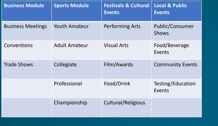 Within each module, there are distinct event types each with different calculation methods, visitor reaches, and other characteristics aimed to highlight the uniqueness of each event. The event impact calculator can calculate the impact of the event utilizing five distinct characteristics; type of event, how long the event will take place, attendees/participants/tickets sold, overnight share, and room rate. Users looking to refresh their skills have support from monthly training webinars, recorded boot camps, and the Online User Community.