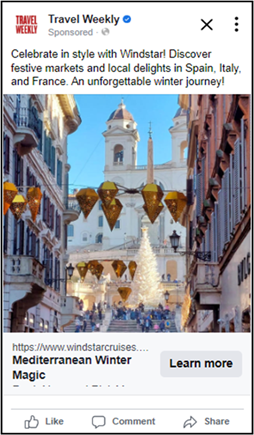Example: By leveraging owned first-party audiences and third-party behavioral targeting, Windstar Cruises are reaching a full range of travel advisors and influencers through social platforms, like Facebook and Instagram.