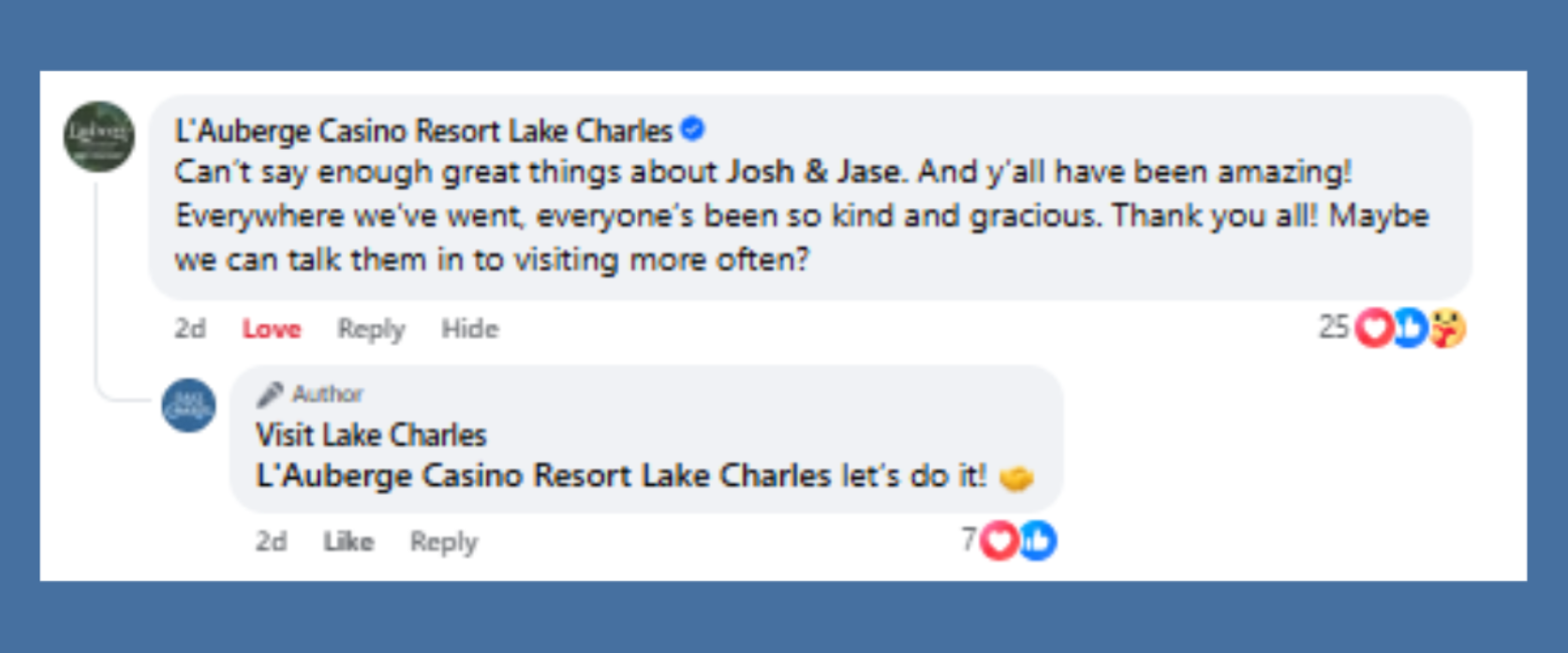 - Engaged proactively from Visit Lake Charles' official channels to acknowledge their presence, signal local support, and steer sentiment.