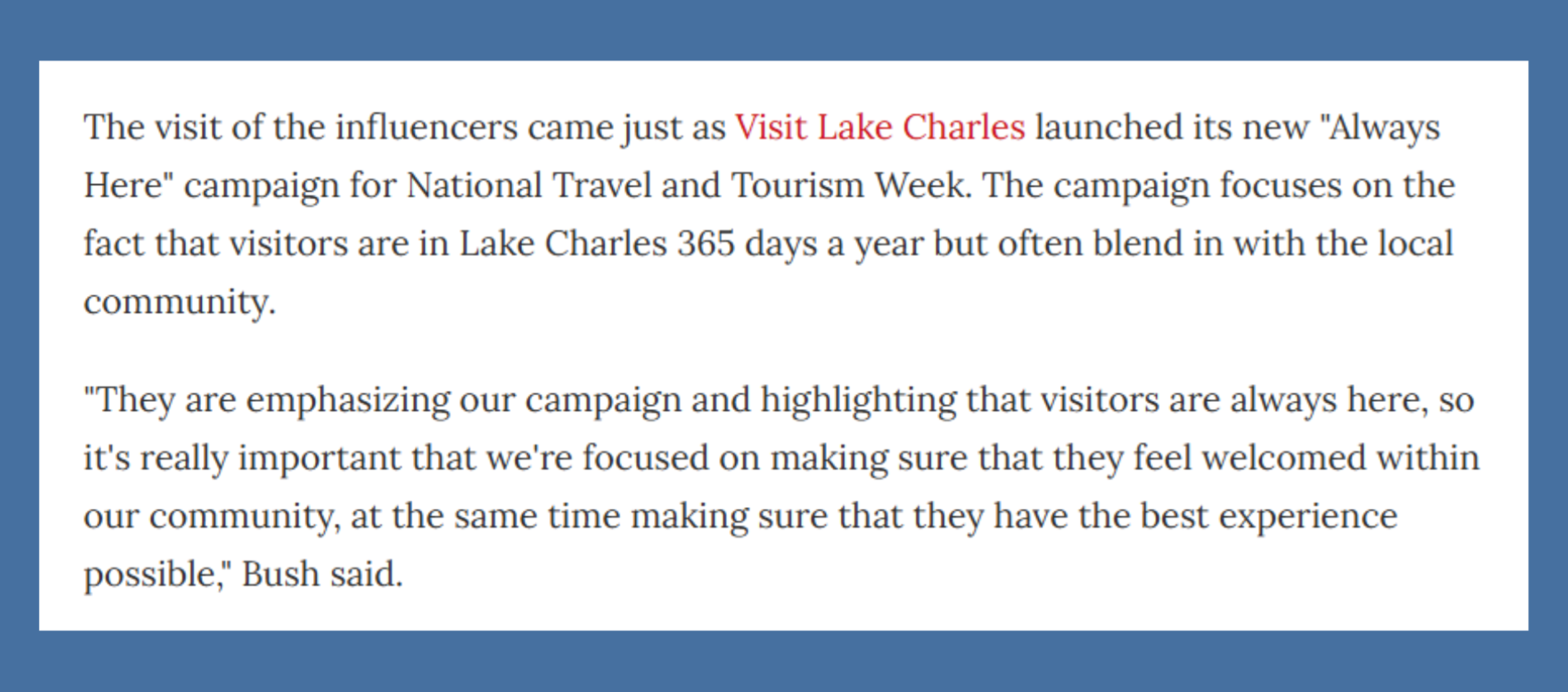 We couldn’t control where they went. But by being present, human, and helpful, we influenced the tone and created a welcoming digital footprint they noticed. Their feedback was positive. They messaged us back. They explored some of our suggestions. And in their own spontaneous way, they left Lake Charles with a good impression.