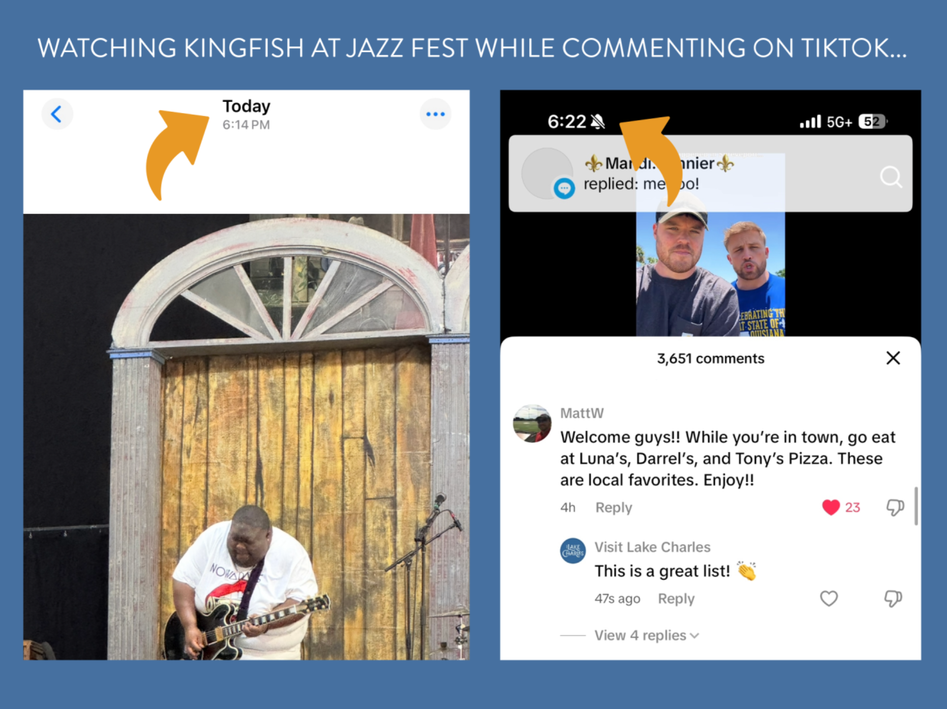 And where was I when I found out? Watching one of my bucket-list musicians perform at Jazz Fest in New Orleans. I received texts from both our CMO and VP of Sales alerting me of the video. At that moment, I knew I had to shift roles from concertgoer to crisis communicator. I immediately began engaging from Visit Lake Charles' channels, commenting, reacting, and sending DMs to make sure they felt welcomed and had accurate, helpful information.