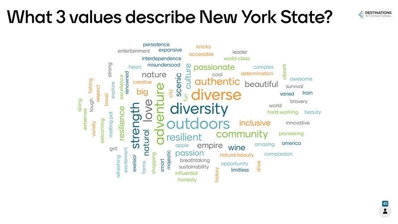 In addition to walking through our values, our tourism lexicon, and becoming a community shared value, I spent a portion of my presentation learning the values of the audience and the destination itself, in this case New York. A lot of these values you can gather and hear through the hallways, during networking breaks and amongst other presentations. New Yorkers are a resilient community. They have been through tough times and have always been able to rally around a cause and for tourism, for the common good for the greater good. Hearing stories about how an attraction pivoted through the pandemic, a wine and spirits vendor adopting a new business model, or even a local destination organization adjusting to the next normal to come through the other side better than before. Values are important at every level; they help us articulate our work into positive worth and reverberate it! When I asked a group of New Yorkers the values they thought represented their state, they of course abundantly shared. Thank you again NYSTIA for the opportunity.