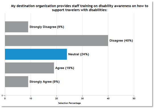 Results from the inaugural year of this assessment show destinations need a clear accessibility strategy. The assessment questions cover multiple aspects of accessibility, from website enhancements to physical accommodations and representation in marketing channels. As a starting point, our leading practices suggest that destinations should begin with accessibility-related training to bring awareness on how to support people with disabilities in a proactive and respectful manner.