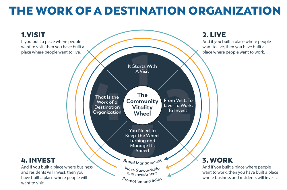 In 2023, Destinations International builds upon Maura Gast’s foundation to provide a one-page graphic that shows not only the ‘circle of life’ that still rings true today but shows how the work of the destination organization is directly connected to how slow or how fast the wheel turns. Through brand management, destination stewardship and investment, and through programs for promotion and sales, the chart shows that it does not happen without us. Destination promotion is a catalyst for community vitality driving what is needed for a community to become that destination where people want to visit, live, work and play.